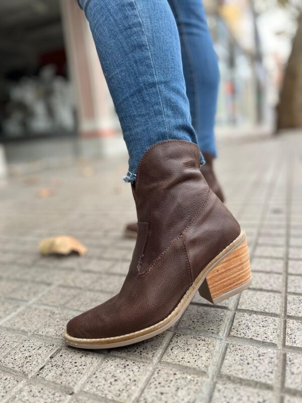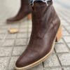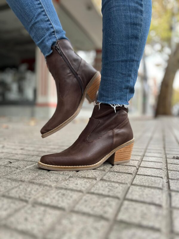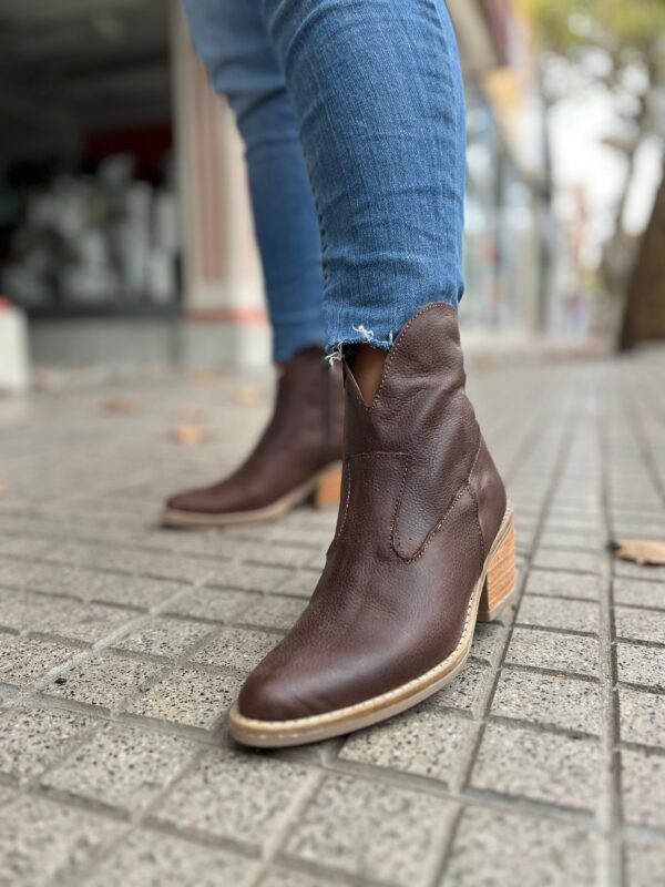 Botita texana en cuero color chocolate, prende con cierre lateral interno.