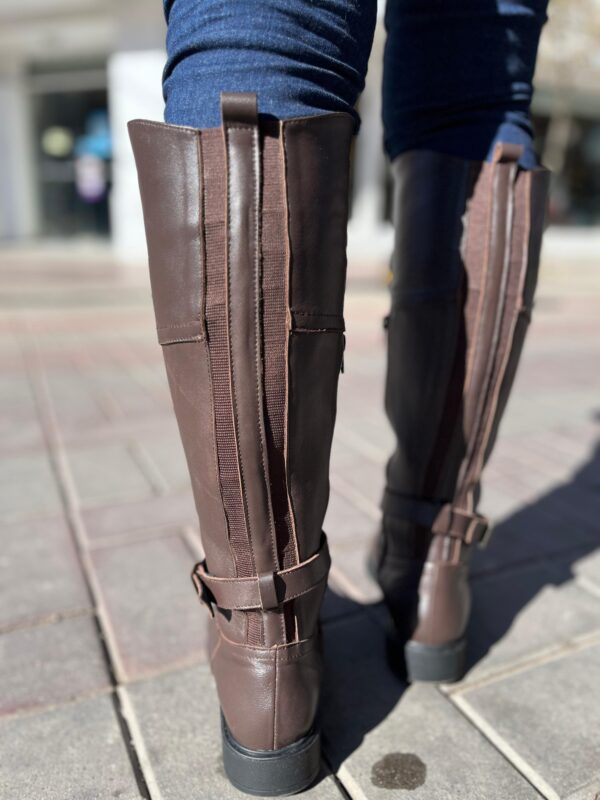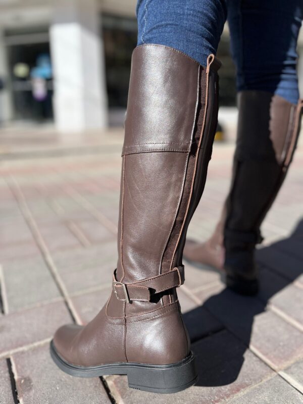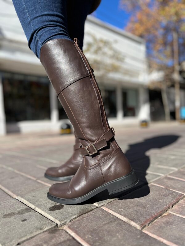 Bota de montar caña alta de cuero vacuno color chocolate y forrada en cuero . A lo largo de la caña en la parte posterior tiene elástico haciendo que se amolde bien a cada tipo de  pierna. prende con cierre a lo largo de la caña del lado interno.