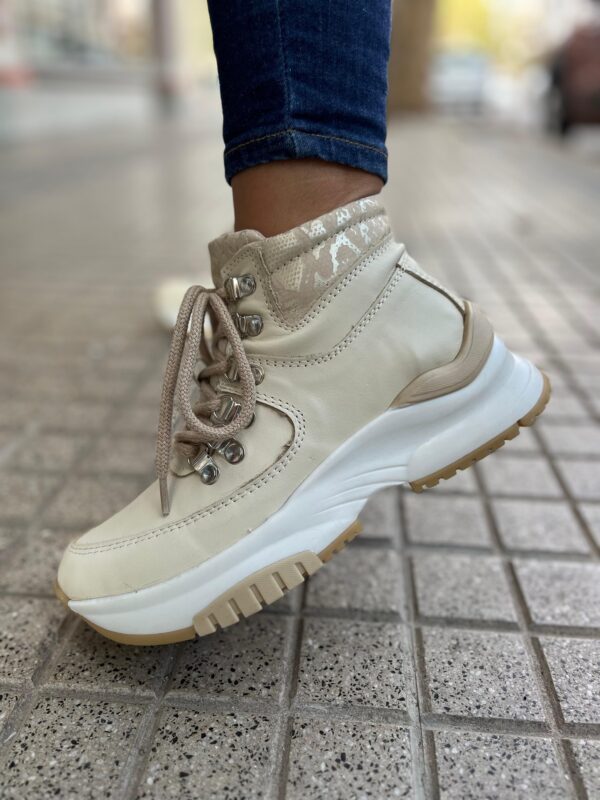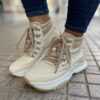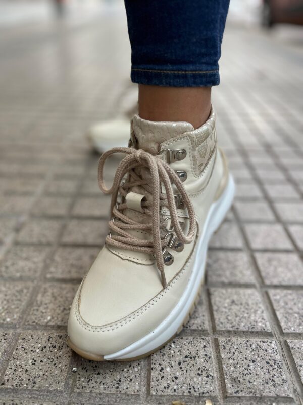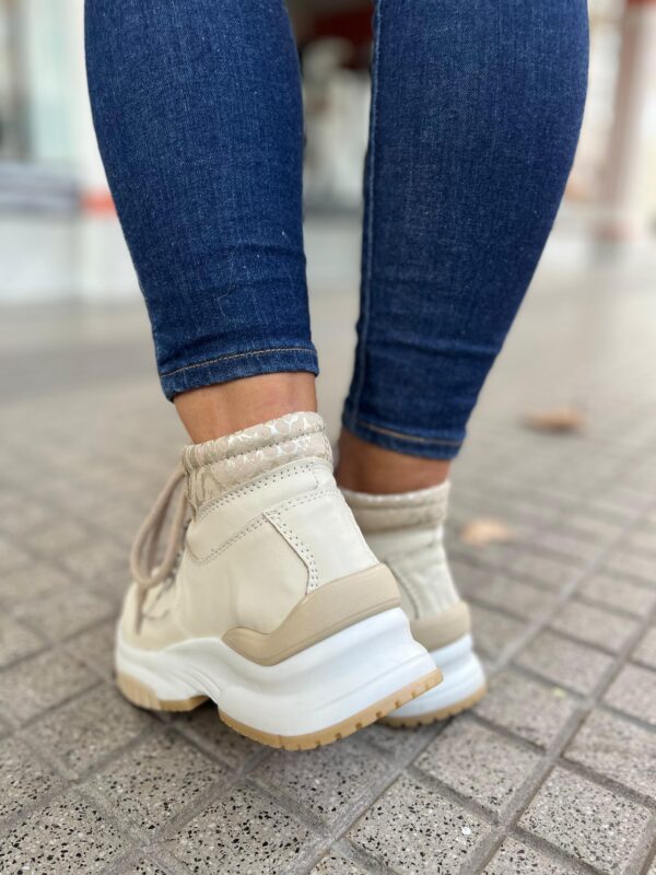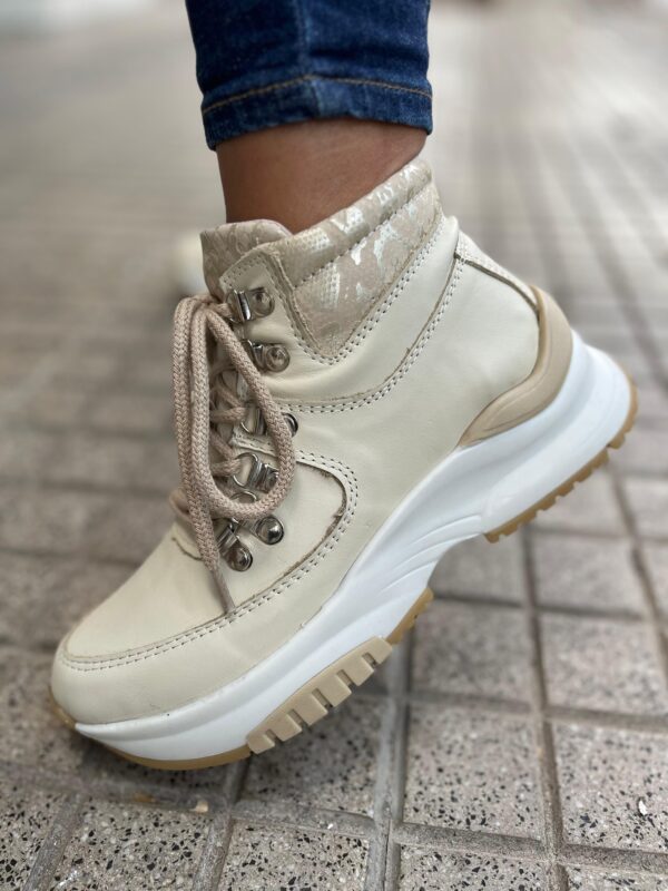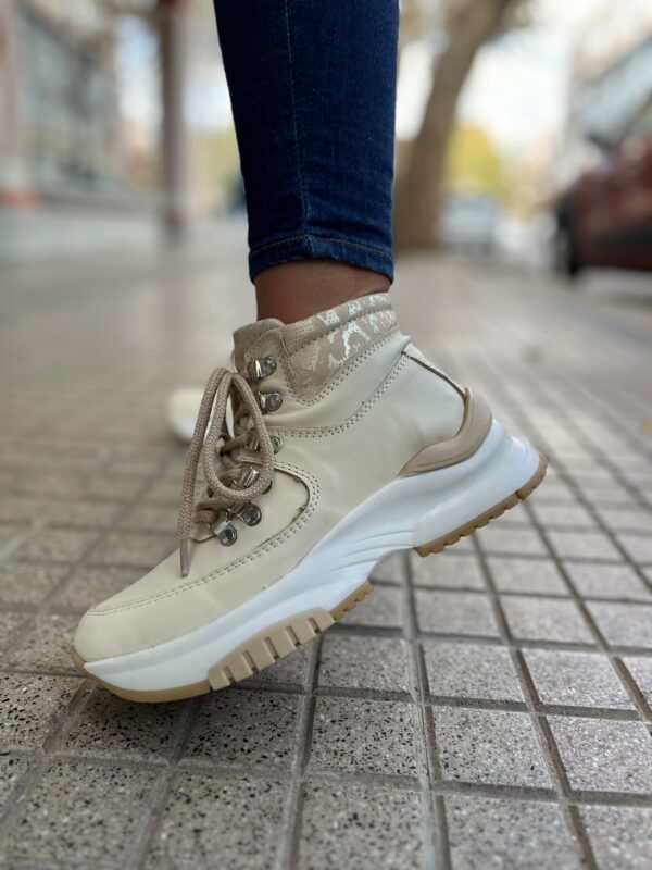 Esta botita de estilo clásico está confeccionada en material tipo cuero color natural, ofreciendo un diseño versátil y elegante. Su suela antideslizante y tacón bajo brindan comodidad y seguridad en cada paso. Ideal para combinar con jeans, pantalones o faldas, aportando un toque sofisticado a tu look diario.