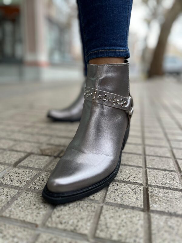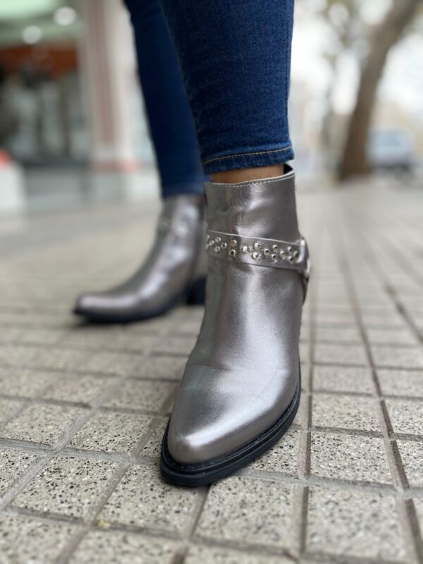 Botita texana de cuero color peltre, estribo con tachitas. Cierre lateral interno. Horma normal