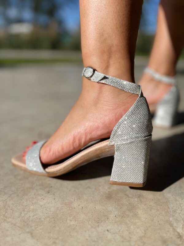 Brillá con estilo con nuestra Sandalia Glitter Plata, el calzado ideal para darle un toque sofisticado a tus looks de fiesta, eventos especiales o salidas nocturnas. Su diseño con tacón ancho de altura media ofrece la combinación perfecta entre comodidad y glamour, permitiéndote lucir impecable sin renunciar al confort.