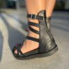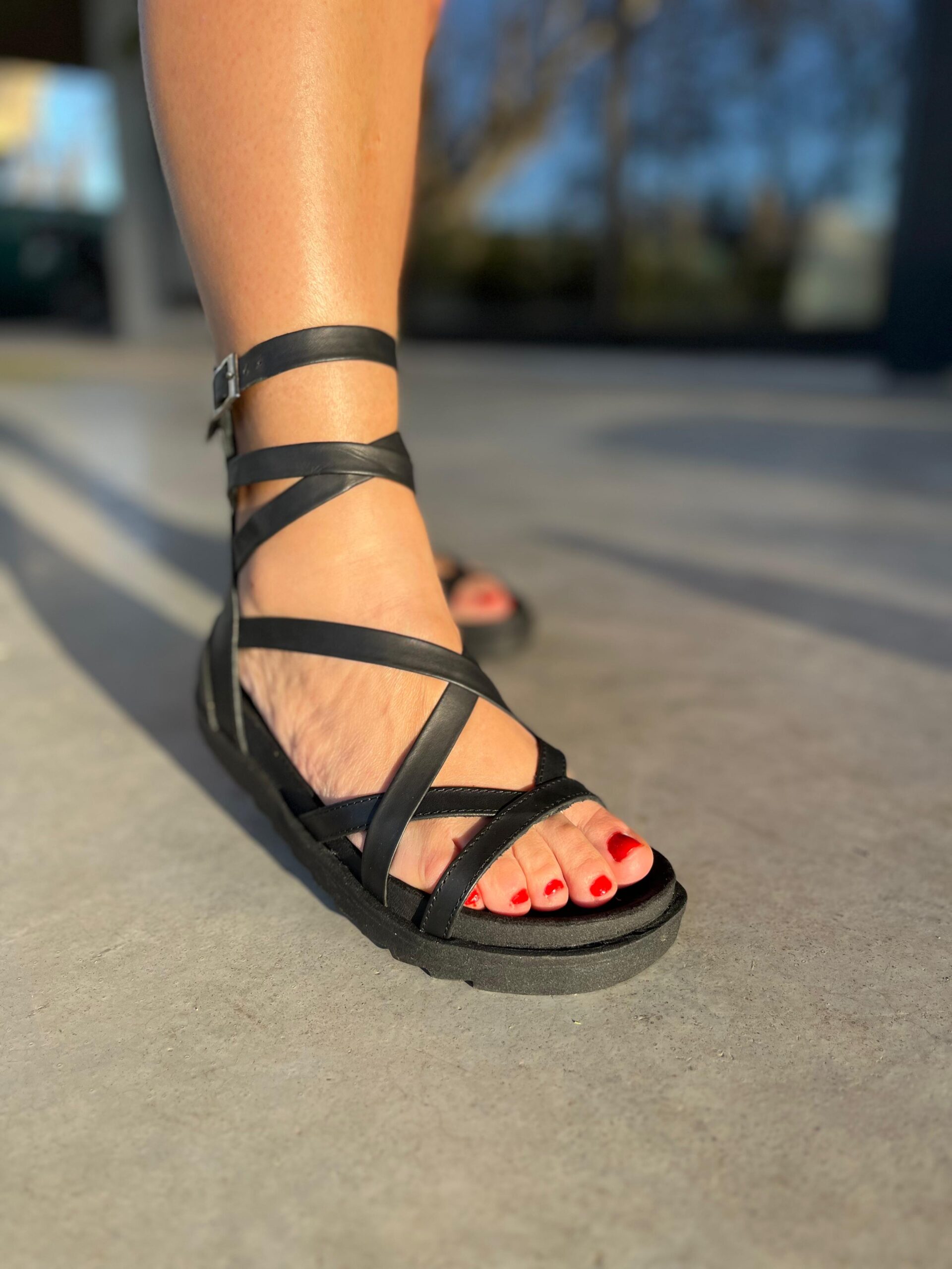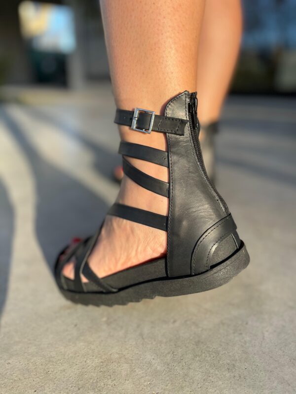 La Sandalia Arezco Cuero negro estilo Romana combina estilo minimalista y confort. Su diseño de tiras cruzadas en cuero de alta calidad brinda un calce firme, mientras que la pulsera regulable en el tobillo asegura mayor estabilidad y ajuste con cierre en la talonera.