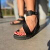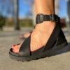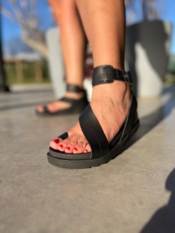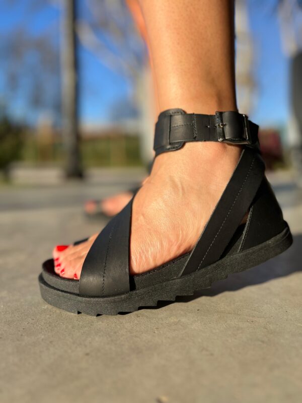 La Pinetto Cuero es una sandalia versátil que combina diseño “tipo romana” moderno con practicidad. Fabricada en cuero negro, cuenta con tiras cruzadas y “ojal” para calzar el dedo gordo, que brindan sujeción y una pulsera regulable en el tobillo, que asegura un calce perfecto.