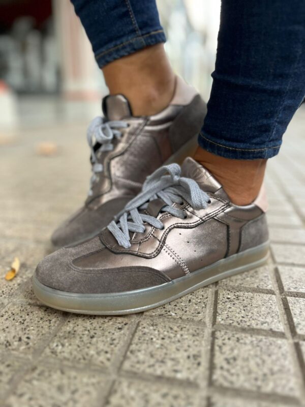 La Zapatilla Gianna Cuero combina comodidad, diseño moderno y materiales premium para que marques tendencia todos los días. Su capellada en cuero peltre, con un mix de terminaciones metálicas y gamuzadas, le da un look sofisticado y urbano que se adapta a distintos estilos y ocasiones.