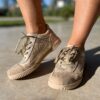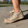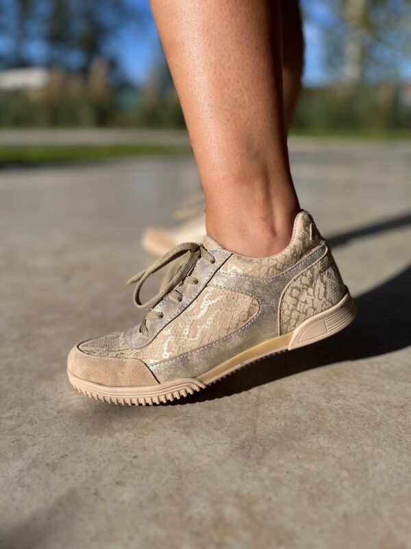 Fabricada en cuero de alta calidad con detalles en textura del cuero en tonos hueso con brillos en oro, esta zapatilla se adapta fácilmente a distintos outfits: desde jeans y joggers hasta un look más relajado y urbano. Además, su suela antideslizante y plantilla acolchada garantizan confort y seguridad en cada paso.