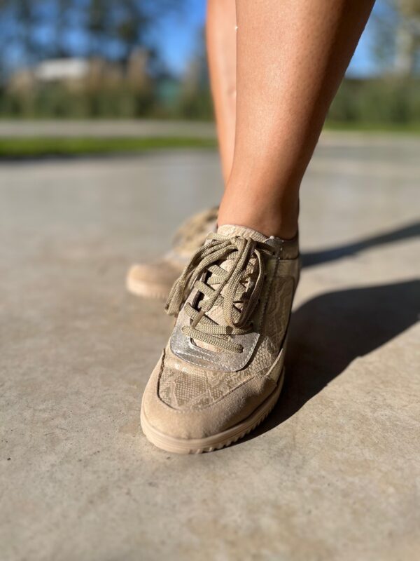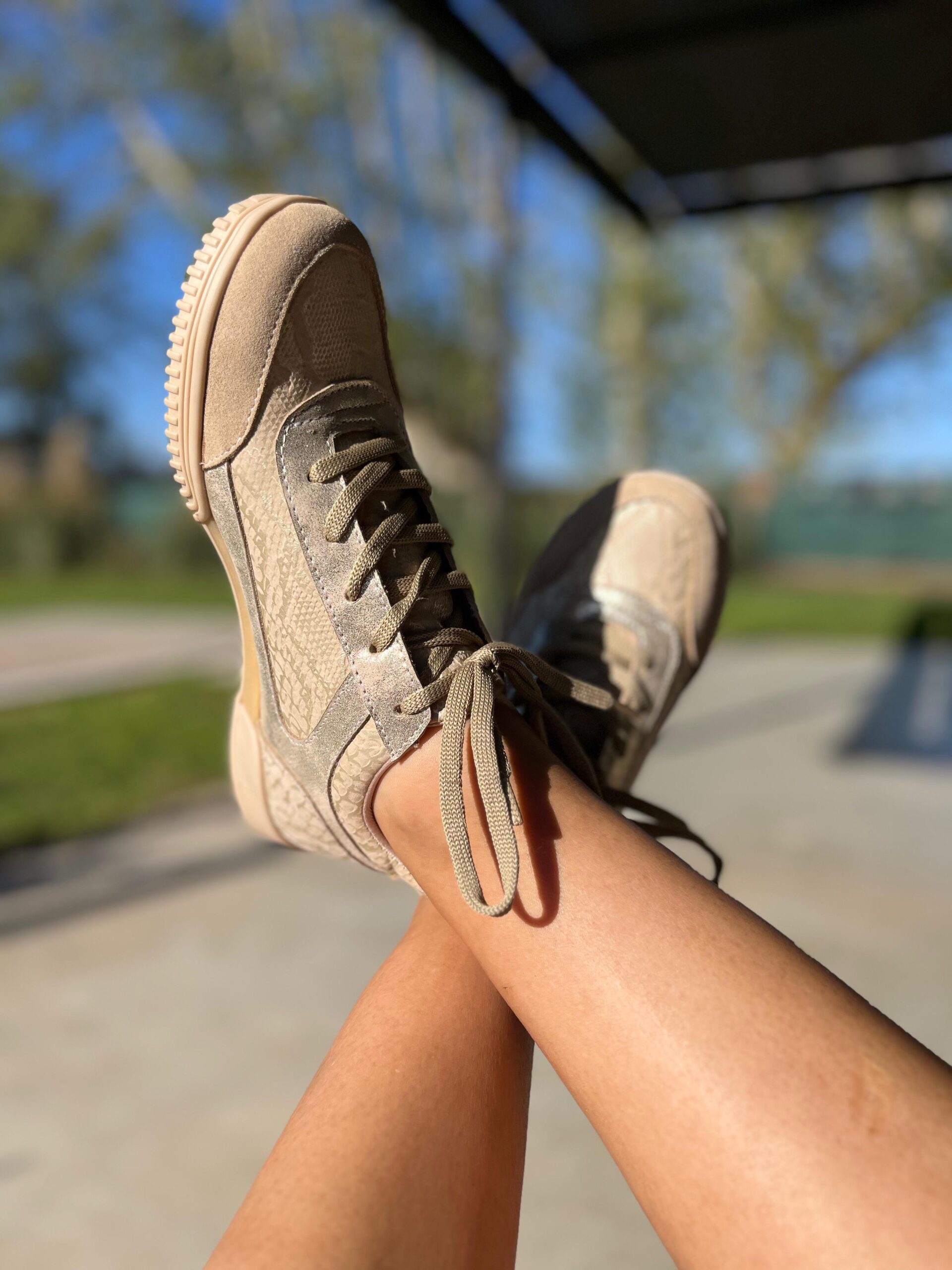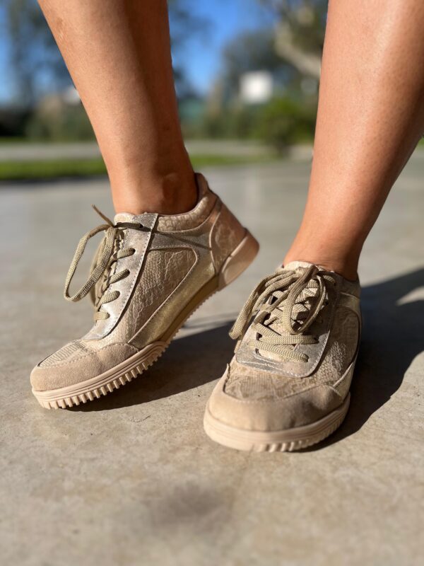 La Zapatilla Sporty Cuero en color hueso con oro combina la comodidad de un calzado deportivo con la elegancia del cuero, creando un diseño único y versátil para el día a día. Su estilo sporty chic es perfecto para mujeres modernas que buscan un look casual con un toque sofisticado.