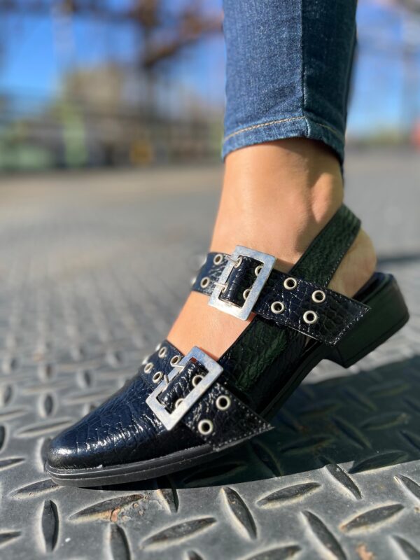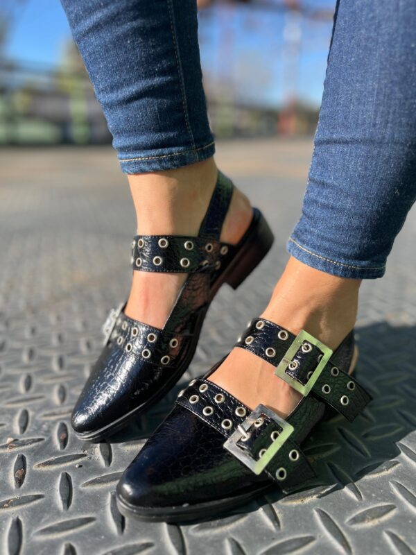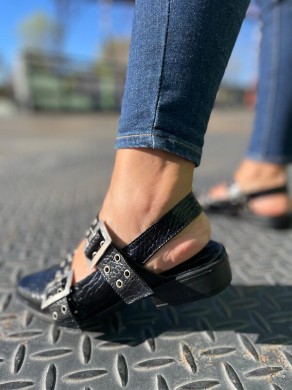 El Zapato Roma de Cuero texturado en croco negro con un brillo leve, es la combinación perfecta de elegancia y estilo urbano. Fabricado en cuero de alta calidad, su diseño moderno con hebillas metálicas en tonos plateados le aporta un toque sofisticado y a la vez canchero.