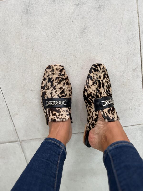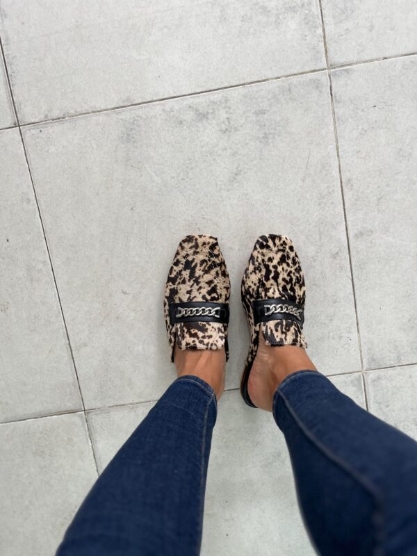El Tarento Cuero Pelo es un calzado moderno y sofisticado que combina la textura del cuero con pelo en animal print con detalles metálicos que elevan cualquier look. Su diseño tipo mule (abierto atrás) aporta comodidad y frescura, ideal para los días de primavera-verano.